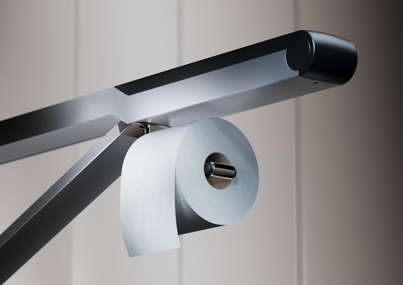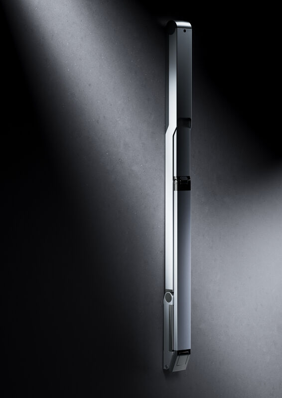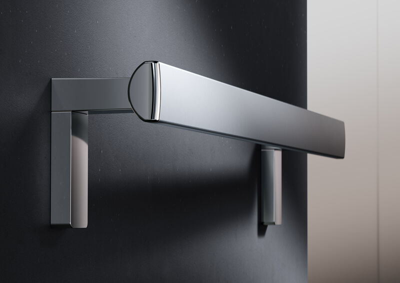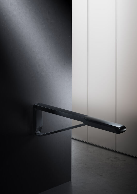 Besonderes Highlight der Serie ist der Stützklappgriff: hochgeklappt steht er einzigartig flach und unauffällig an der Wand. Beim Hochklappen schieben sich die Profile des Stützklappgriffs auseinander. So ergibt sich an der Wand die einzigartig flache, elegante und nahezu skulptural anmutende Optik.
