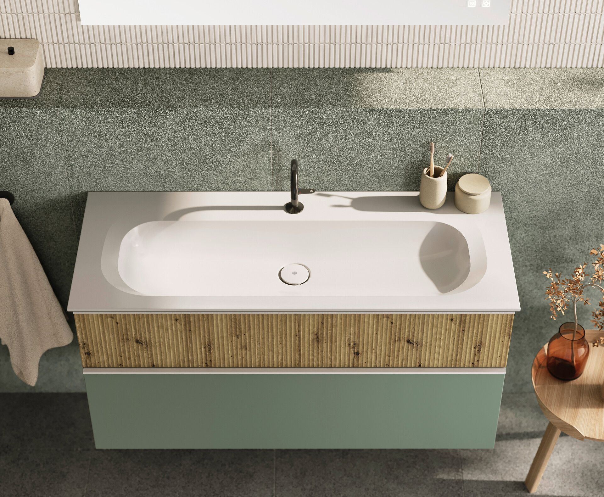 Für das Badezimmer hat Designer Patrick Frey diesen Trend zusammen mit burgbad nun praxistauglich umgesetzt: Statt der horizontalen Profilierung mit Plisseefronten bei der Originalkollektion Fiumo zeigen die neuen Fronten von Fiumo 2.0 ein vertikales Muster. Die eingefräste, thermofolierte Oberflächenstruktur wirkt dabei eher filigran als robust – ein feines Linienmuster, das dem Möbel mit seinem Schattenspiel Lebendigkeit verleiht und es weniger massiv wirken lässt. Typisch burgbad: Mit den weich ausgearbeiteten Kanneluren ist das Oberflächenrelief nicht nur besonders pflegeleicht, sondern erweist sich auch als echter Handschmeichler.